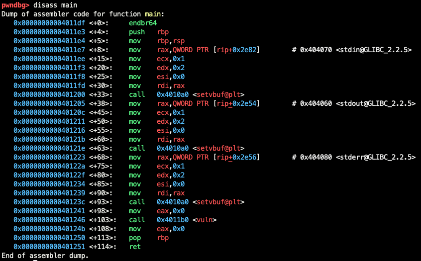 쉽게 얘기해서, 우리가 vuln() 함수를 호출한 다음에 win() 함수를 호출하여 쉘을 탈취하는 과정을 진행하고 있기 때문에 함수와 함수 사이에 일종의 '분기점'을 나눠서 스택을 구분지어 주는 코드를 삽입해야 하는 것이다. (나는 그렇게 이해하고있음.)