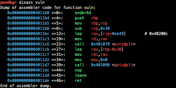 딱히 특별한 취약점이 보이지 않는다. 하지만 main+103에서 vuln() 함수를 호출하고 있다. vuln() 함수를 한 번 보도록 하자.