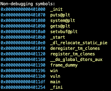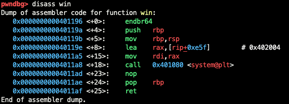 그럼 이제 우리는 return 주소를 win() 함수 주소로 덮도록 Exploit 코드를 짜면 된다.