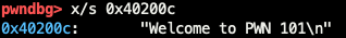 vuln+8에서 rsp-0x30만큼 공간을 할당하고 puts() 함수를 통해 무언가를 출력해낸다. 아마 위에서 바이너리 실행했을 때 나온 "Welcome to PWN 101\n" 이지 않을까 싶다. 정말인지 확인해보고 싶다면 0x40200c를 확인해보면