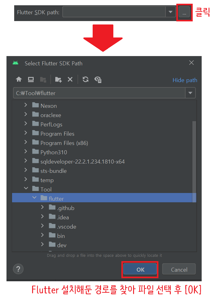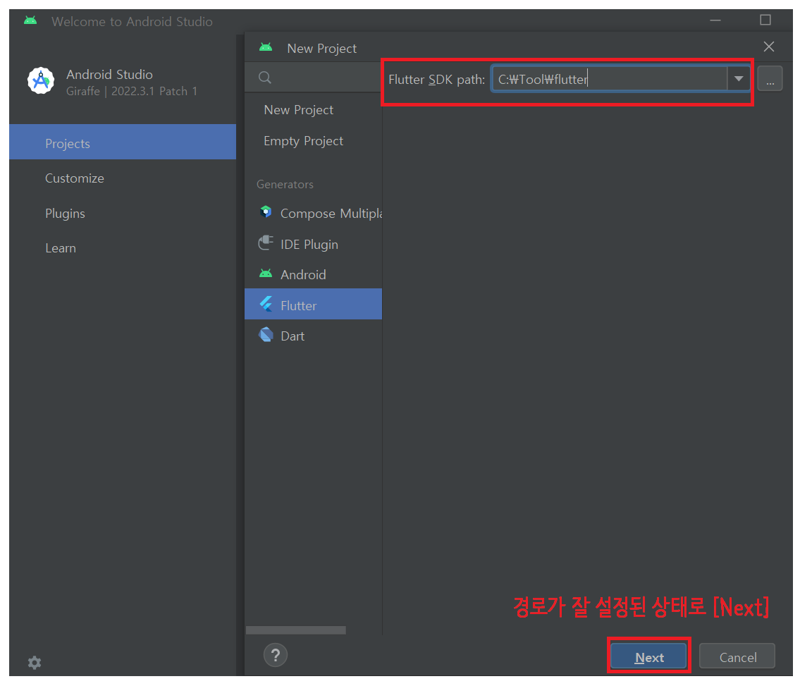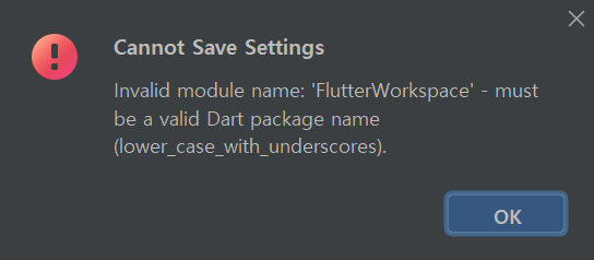 Project name: 원하는 이름 지정Project location: 원하는 디렉토리를 프로젝트를 저장할 곳으로 지정(패키지 생성 시 lower_case_with_underscores 규칙 지키기)FlutterWorkspace가 아닌 flutter_workspace 여야 생성된다.