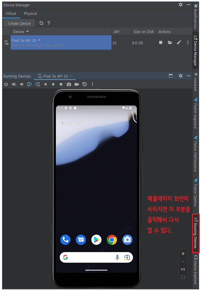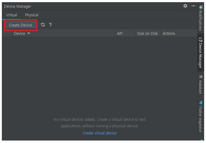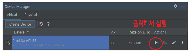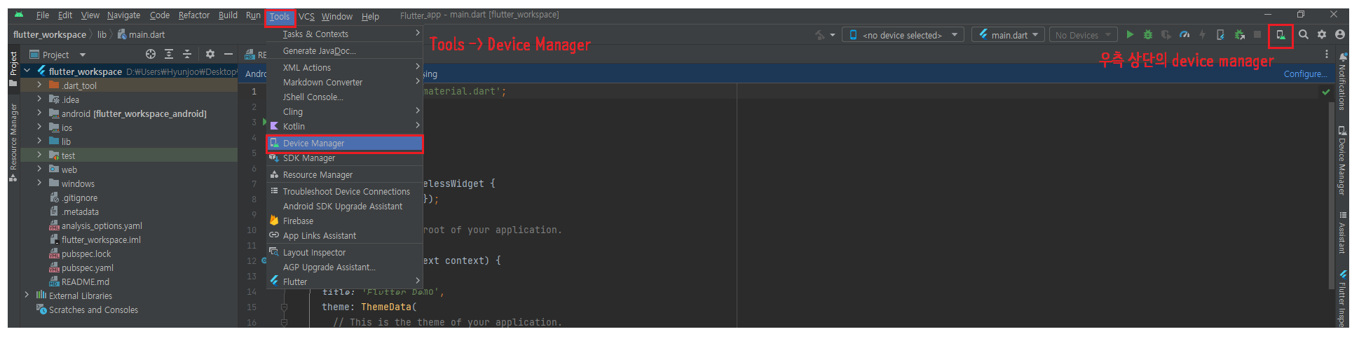 Android language나 IOS language, Platforms는 필요에 따라 설정하면 된다. (Kotlin이나 Swift를 모른다고 해서 앱을 만들 수 없는 것은 아니다.)우측 상단의 Device Manager 클릭, 혹은 상단 메뉴의 Tools -> Device Manager 실행