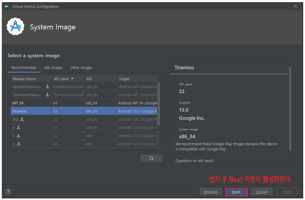 설치했던 SDK Platforms 버젼에 맞게 System Image를 설치한다.