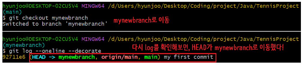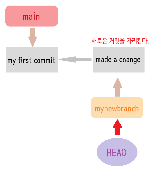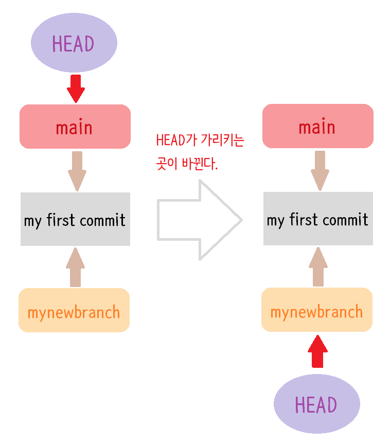 # 이렇게 하면 HEAD는 mynewbranch 브랜치를 가리킨다.