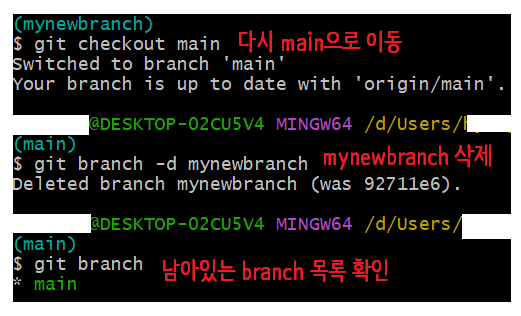 브랜치에 통합(merge) 되었기에 더 이상 필요없게 된 경우 아래 명령어를 이용해 mynewbranch