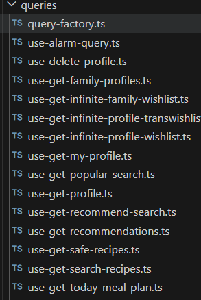 그래서 queryOptions를 사용해서 하나의 파일에 모아서 여러 쿼리들을 한꺼번에 관리했다. 내가 선택한 방법은 카테고리별로 관리하는 것이다.