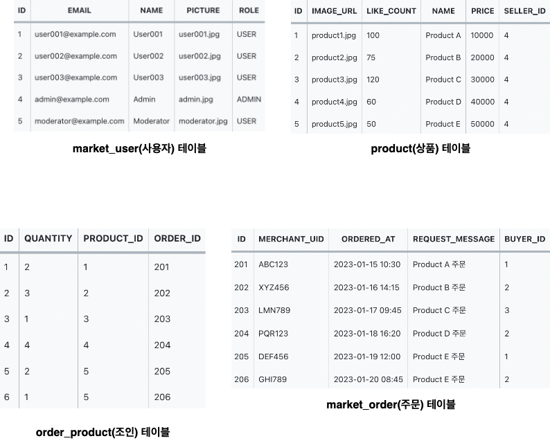 만약 1번 사용자(user_id = 1)가 상품을 주문하면 다음과 같은 비즈니스 로직이 수행되어야 합니다. 이 과정은 "market_order(주문)" 테이블과 "order_product(조인)" 테이블의 정보를 사용하여 수행됩니다.