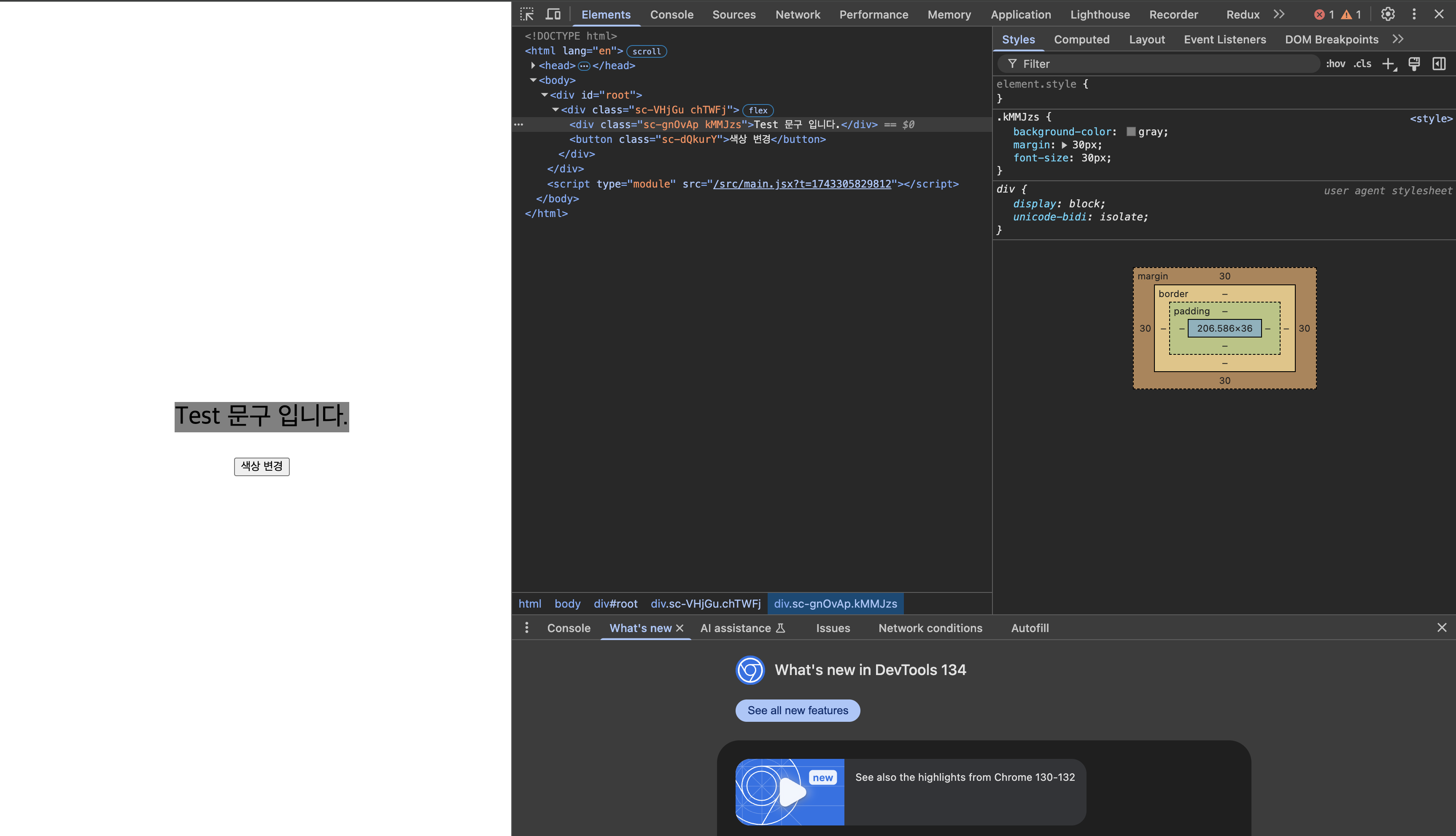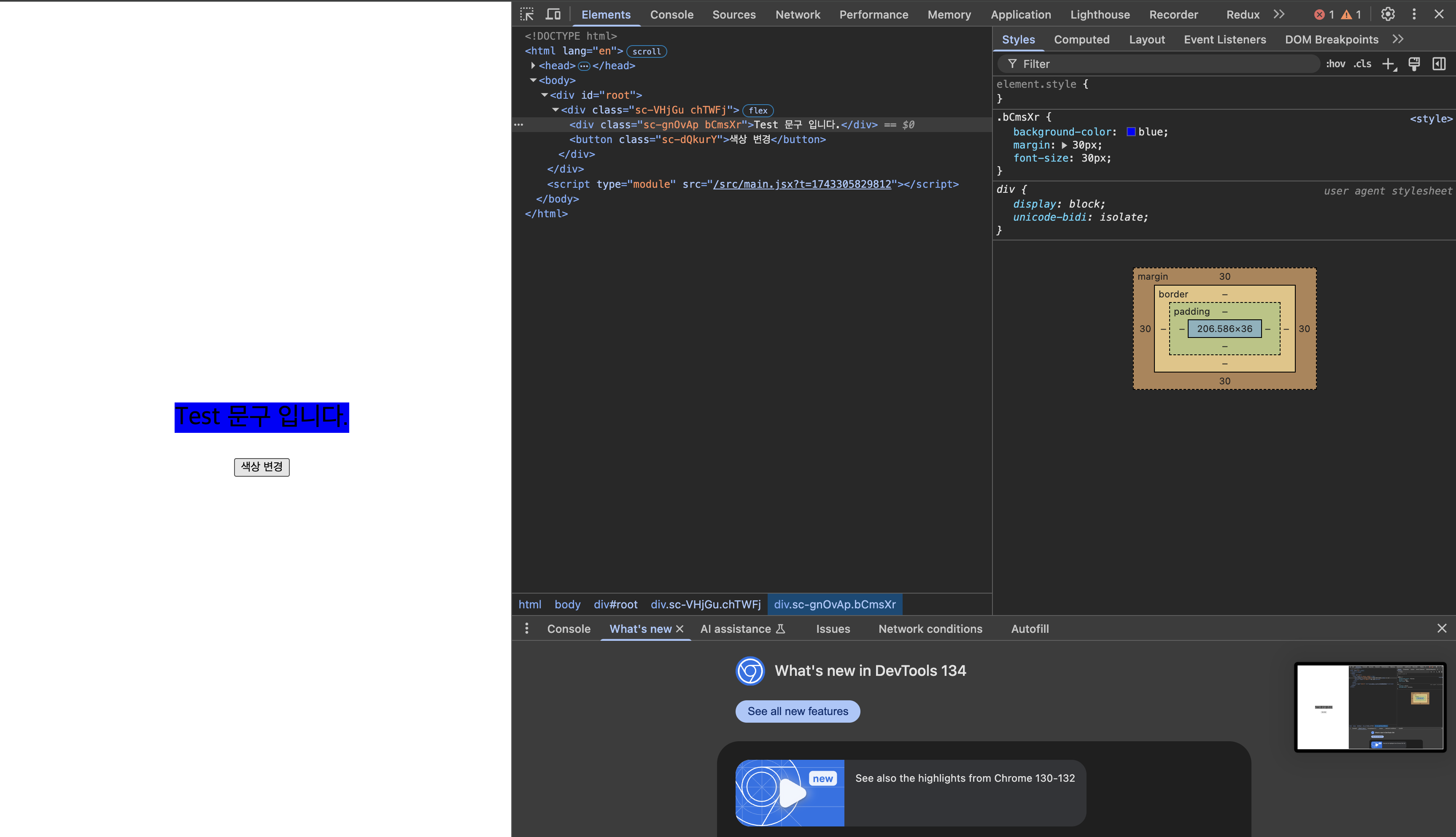Button을 통해 'TEST 문구 입니다' 생상을 변경하는것을 styled-component로 실습 환경을 만들어 봤습니다.