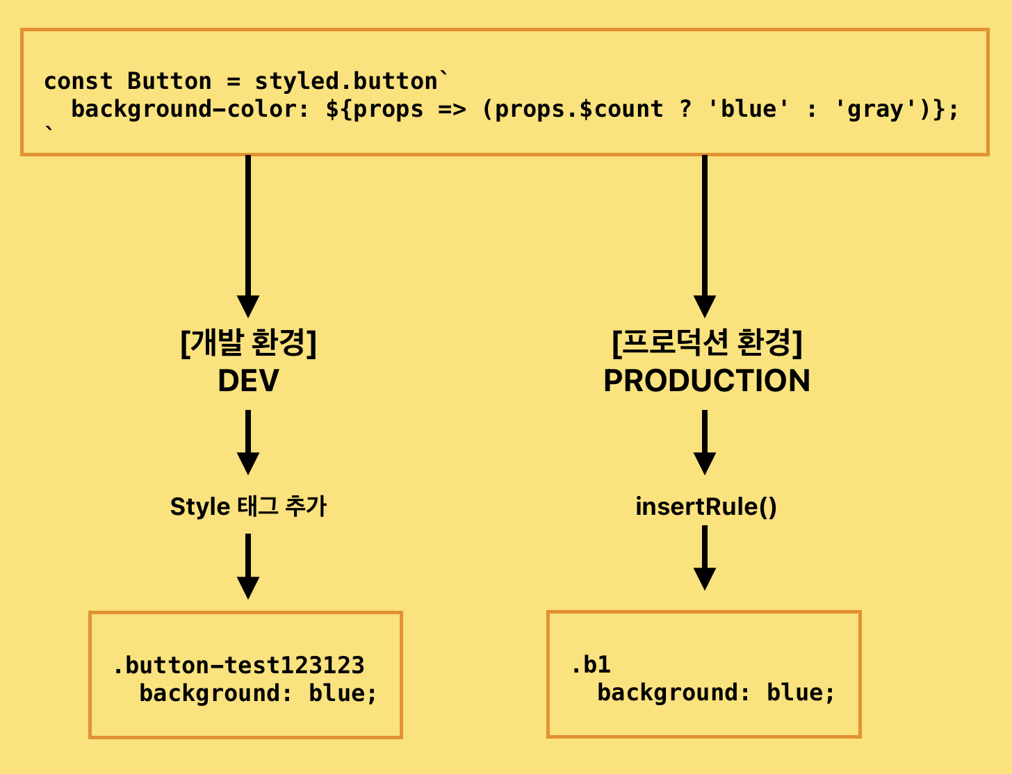 프로덕션 환경 (빠른 속도) : 클래스명 압축과 CSSOM를 통해 빠른 랜더링을 지원합니다. 즉, 성능과 최적화를 신경쓴것을 볼수있습니다.