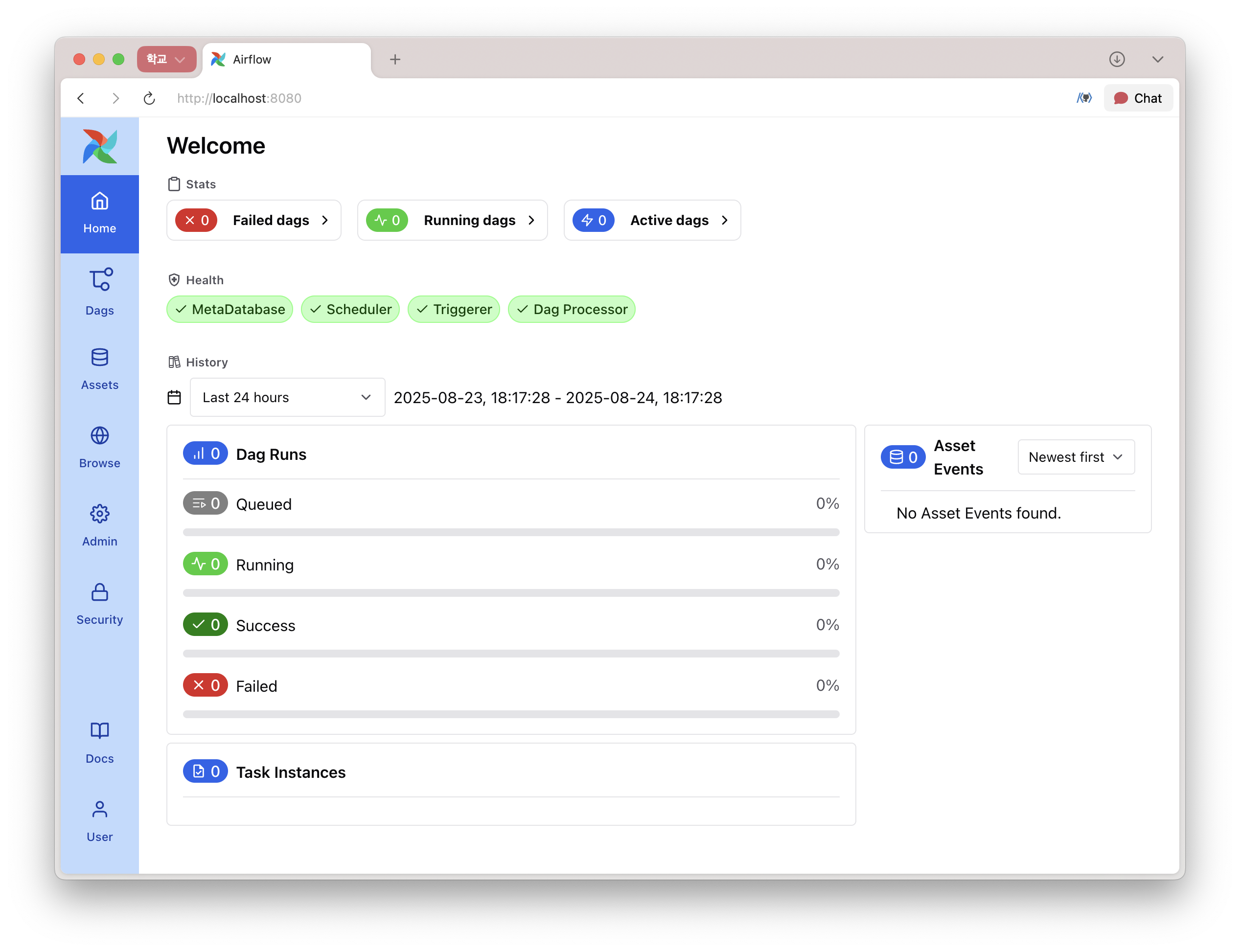 curl -LfO 'https://airflow.apache.org/docs/apache-airflow/3.0.4/docker-compose.yaml'mkdir -p ./dags ./logs ./plugins ./configecho -e "AIRFLOW_UID=$(id -u)" > .envbrew install docker-composedocker-compose --versiondocker-compose up airflow-initairflow-init-1 exited with code 0docker-compose upairflow-docker/dags 폴더에 파이썬 파일을 추가하면 자동으로 인식됨.docker compose 명령이 안 될 때docker-compose(하이픈 포함) 명령어로 실행.