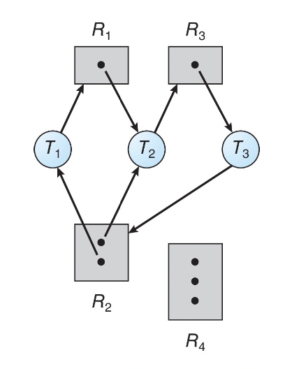 스레드 집합 {T₀, T₁, ..., T𝗇}이 존재하며, T₀이 T₁이 보유한 자원을, T₁이 T₂가 보유한 자원을, ..., T𝗇이 T₀가 보유한 자원을 대기하는 순환 구조가 있는 상태