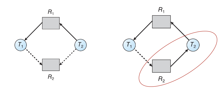 위 경우 R₂는 자유로운 상태이지만 T₂에 할당될 경우 cycle이 생기기 때문에, 데드락 발생 가능성이 생겨 할당할 수 없다.