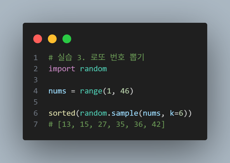 # sample(seq, k) : 시퀀스에서 "중복 없이" k개의 요소 리스트 반환