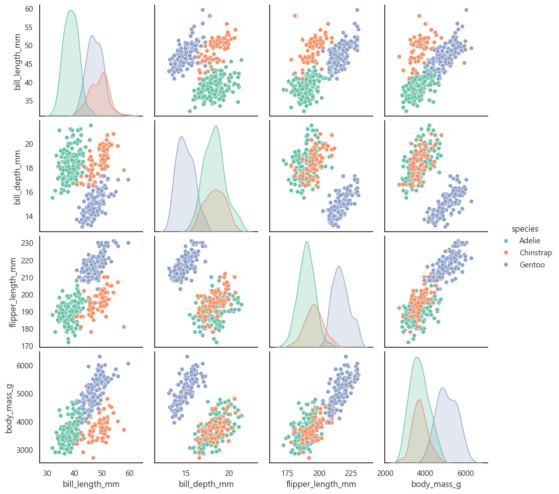 pairplot()sns.pairplot(data=penguins, hue="species", palette="Set2")