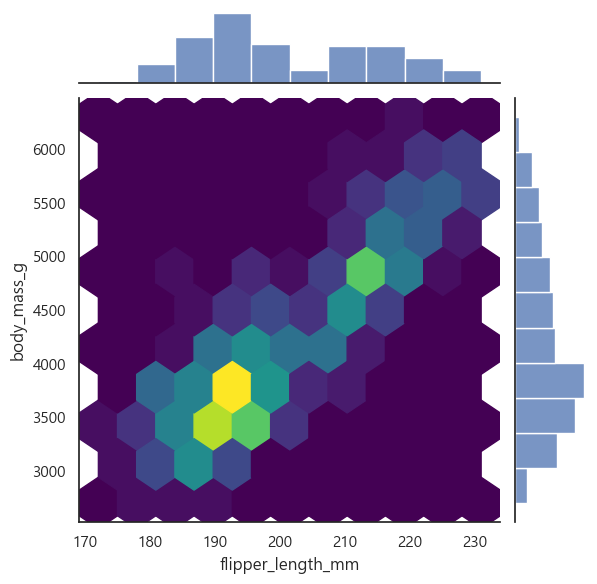 jointplot()sns.jointplot(data=penguins, x="flipper_length_mm", y="body_mass_g", kind="hex", cmap="viridis")