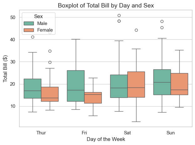plt.title("Boxplot of Total Bill by Day and Sex", fontsize=14)