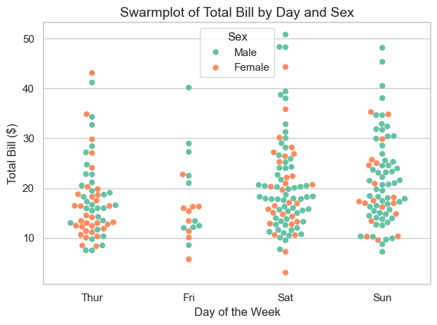 swarmplot()stripplot 과 비슷하지만, 점이 겹치지 않게 자동으로 퍼짐sns.swarmplot(data=tips, x="day", y="total_bill", hue="sex", palette="Set2", size=6)