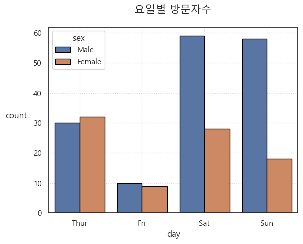 plt.title("요일별 방문자수", size=15, pad=20)