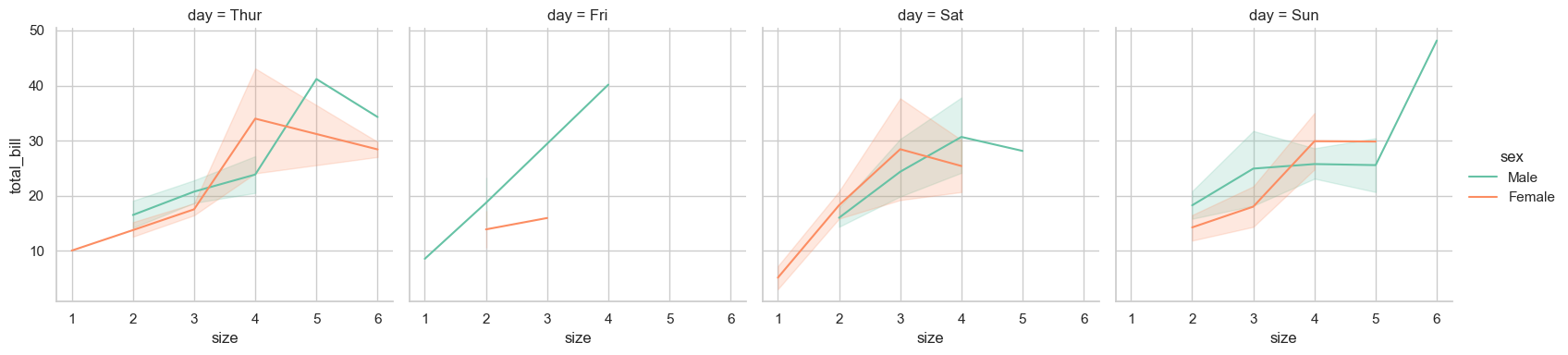 sns.relplot(data=tips, x="size", y="total_bill", hue="sex", col="day", kind="line", markers=True, dashes=False, palette="Set2", height=4, aspect=1)