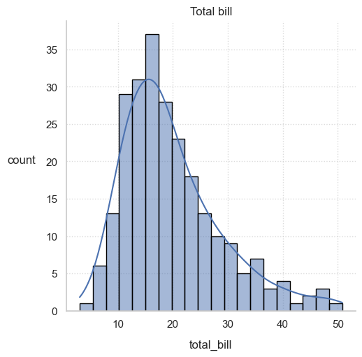 displot()sns.displot(data=tips, x="total_bill", edgecolor="black", alpha=0.5, kde=True, bins=20)