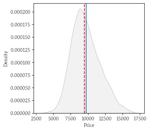 plt.axvline(df['Price'].median(), color='red', linestyle='--')