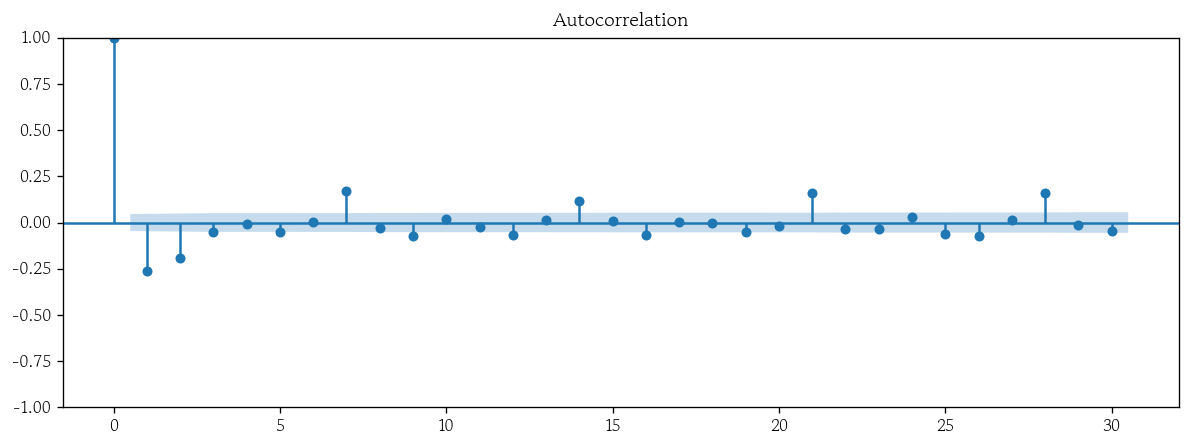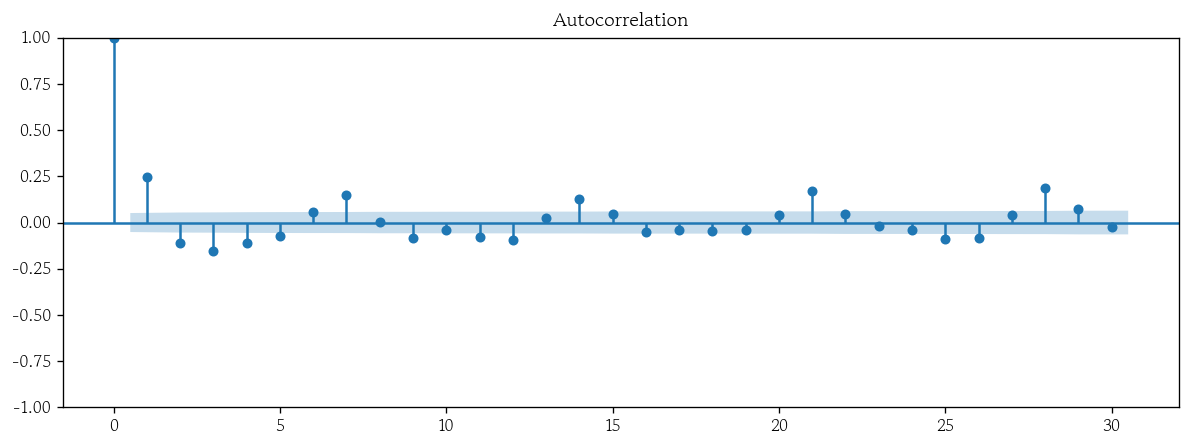 plot_acf(x=sarimax_resid, lags=30);