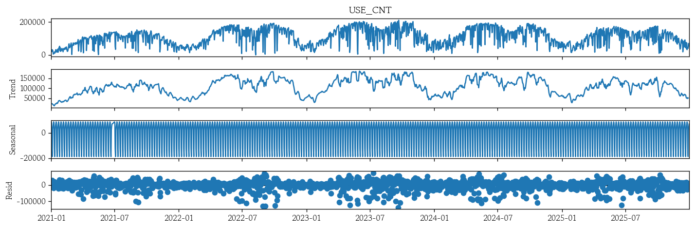 | • 계절성은 없거나 약함 | • 기온, 강수량, 이벤트, 정책 등 외생변수의 영향이 큼 |