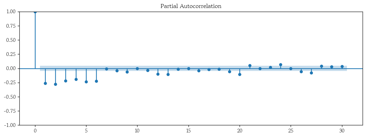 plot_pacf(x=use_diff_1, lags=30);