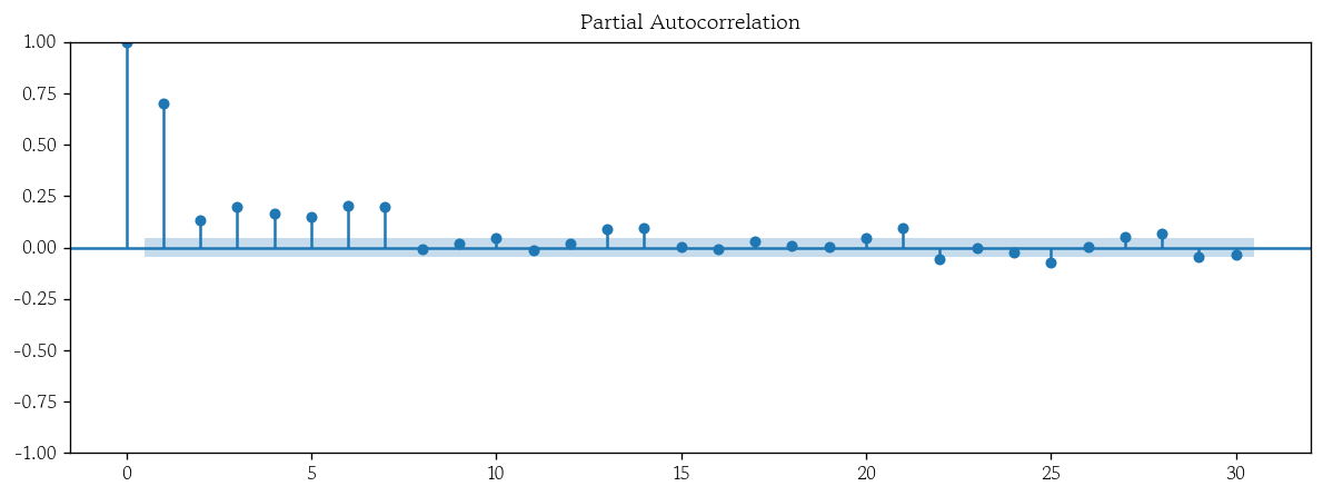 plot_pacf(x=df, lags=30);
