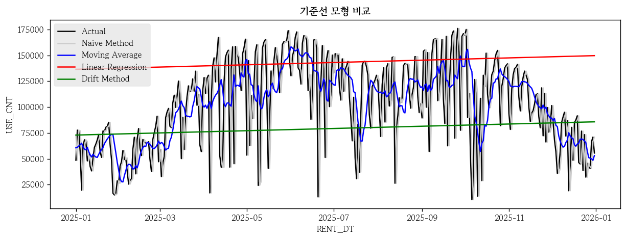 plt.title(label='기준선 모형 비교', fontweight='bold')