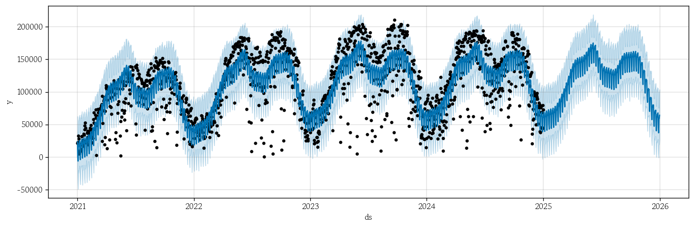 pp_exog.plot(pp_exog_yhat, figsize=(12, 4))