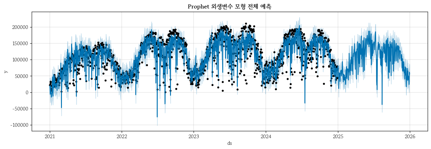plt.title('Prophet 외생변수 모형 전체 예측', fontweight='bold');