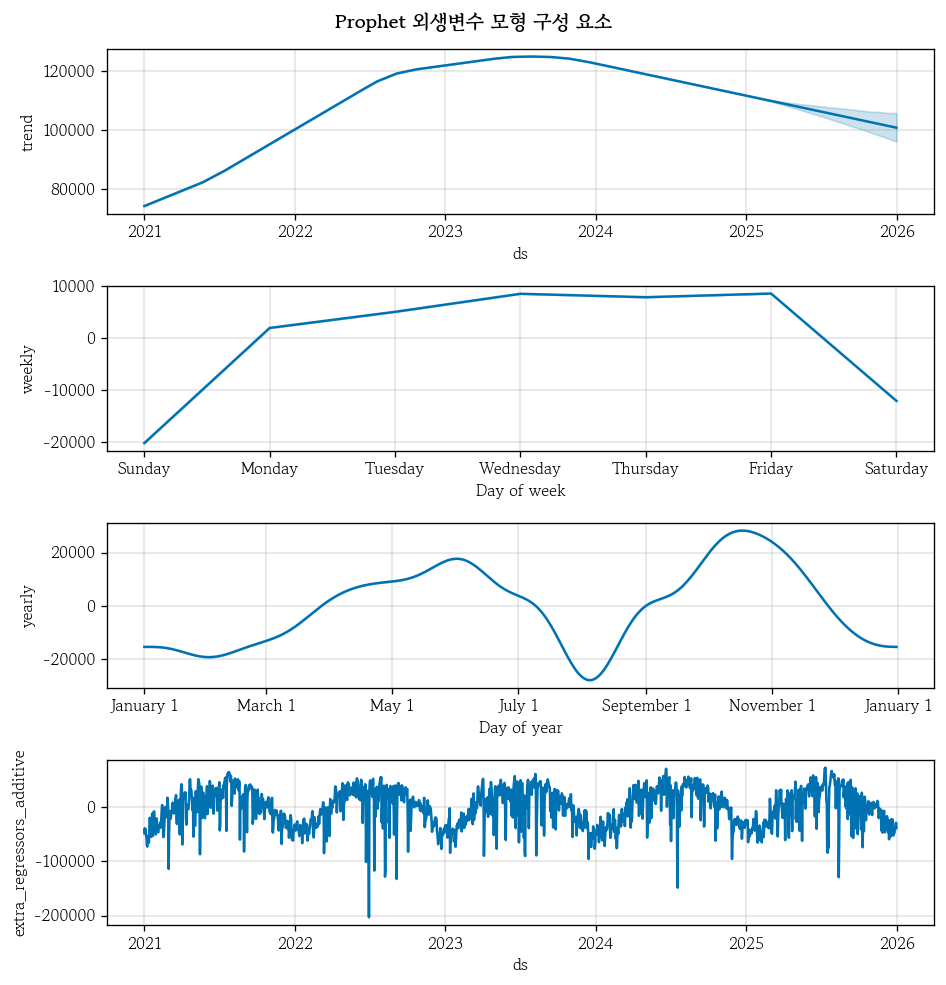 fig.suptitle('Prophet 외생변수 모형 구성 요소', fontweight='bold', y=1.02);