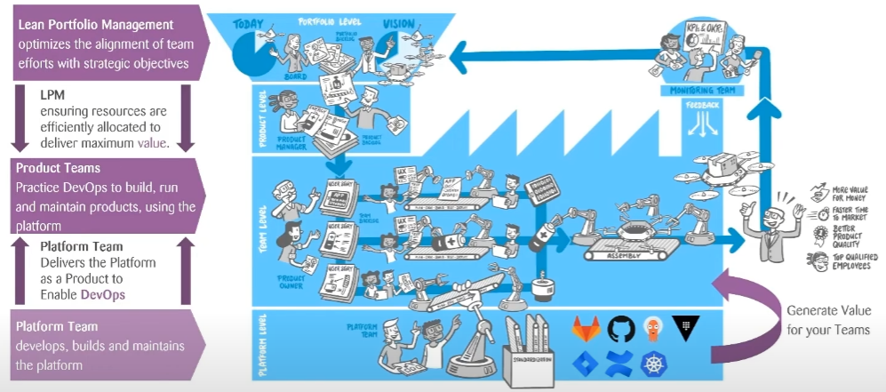 이를 해결하기 위해 '플랫폼 엔지니어링'을 통해 개발팀의 부담을 줄여주고, 더 나아가 '디지털 팩토리'라는 전체론적 접근 방식을 통해 회사의 전략과 실행을 연결하여 소프트웨어 개발을 산업화해야 한다.