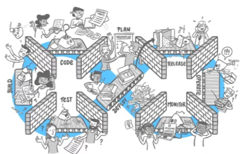 -> 고객과 비즈니스 부서가 아이디어를 가지고, 계획들을 문서와 지라 (Jira) 티켓으로 만들어, '혼란의 벽' 너머로 개발팀에 던짐