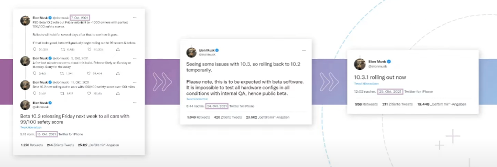 배포후, 10.3 버전에 문제가 생겨 10.2 버전으로 롤백해야한다고 트윗을 올림. -> 도로 위에서 달리고 있는 테슬라 차량에 대해 무선 업데이트를 통해 이전 버전으로 롤백을 함.