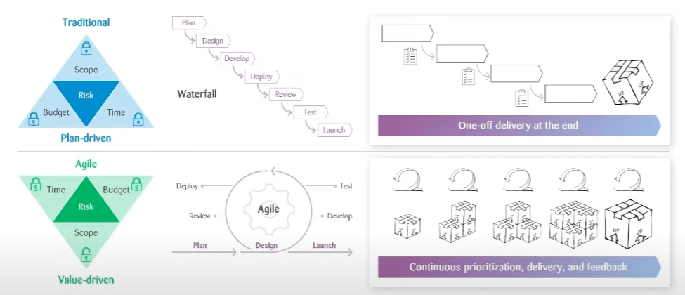 그러다 2000년경 WaterFall Project 방식은 소프트웨어 개발 방식에 맞지 않다 주장하여 '시간과 예산은 고정하고, 범위는 가변적인 애자일 (Agile) 방식'으로 더 작은 increment 단위로 결과물을 전달하게 되었으며, 해당 방식이 오늘날 우리가 프로젝트를 수행하는 방식이다.