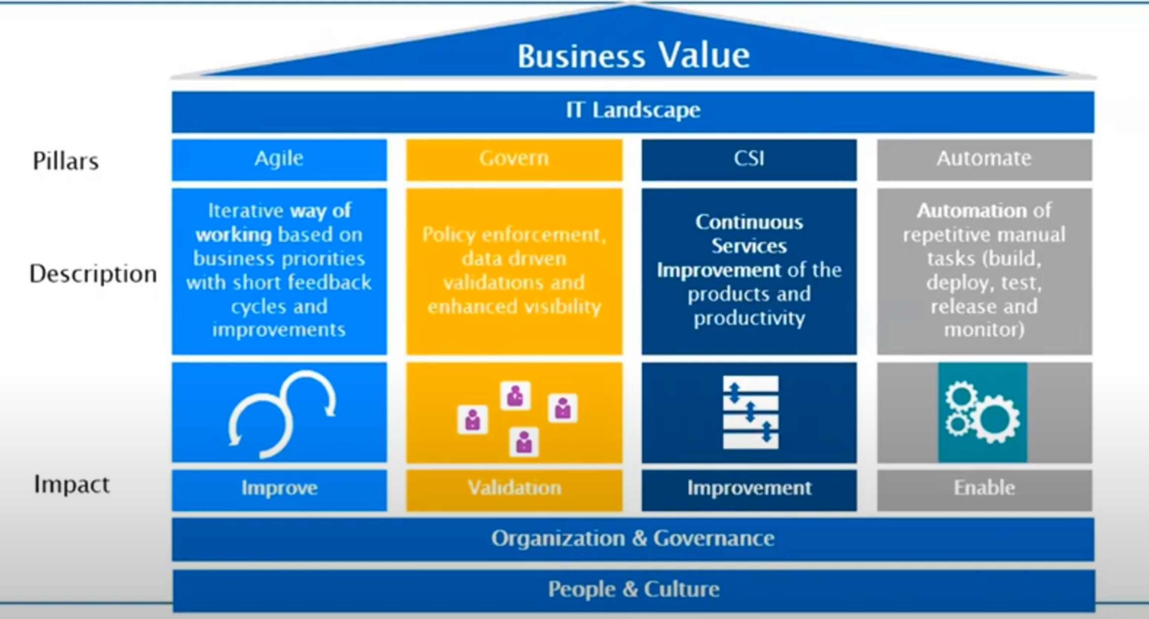 속도와 가치: 비즈니스를 지원하기 위해 빠르고, 민첩하며 (Agile), 가치 중심적인 (Value-driven) IT가 필요함.