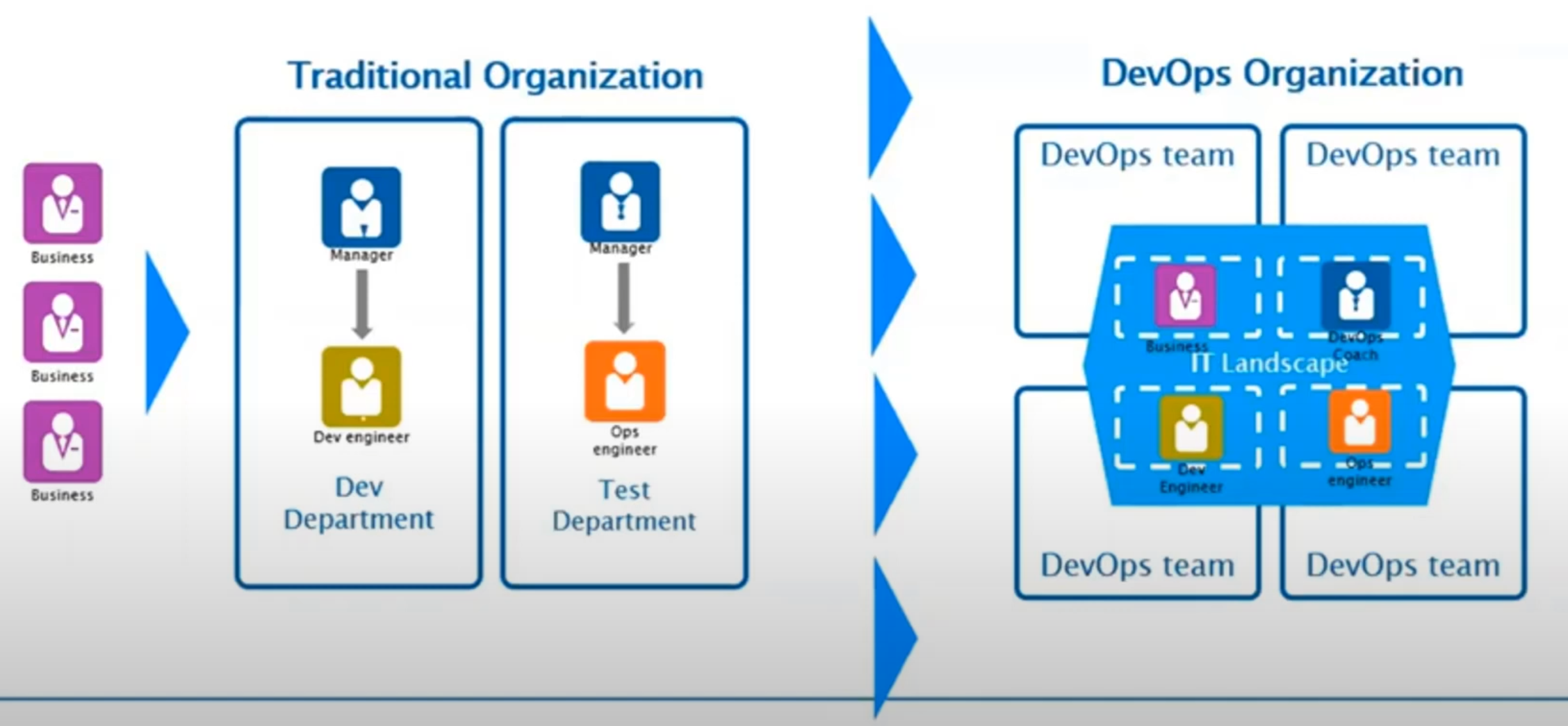 과거에는 개발 부서, 테스트 부서 등이 명확히 분리된 사일로 (Silo) 구조였다. 이는 부서 간의 협업을 어렵게 하고 병목 현상을 유발하는 주요 원인이었다.