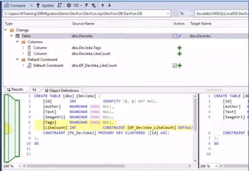 코드 (SSDT 프로젝트)와 실제 운영 중인 데이터베이스 간의 양방향 비교 기능을 제공