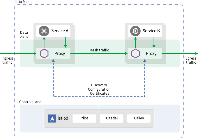 이 모든 과정의 설정과 정책은 Istiod인 제어 평면에 의해 관리된다. 즉, 모든 네트워킹 로직은 데이터 평면으로 이관되며, 애플리케이션 코드는 네트워크 통신 방식에 대해 알 필요가 없다.