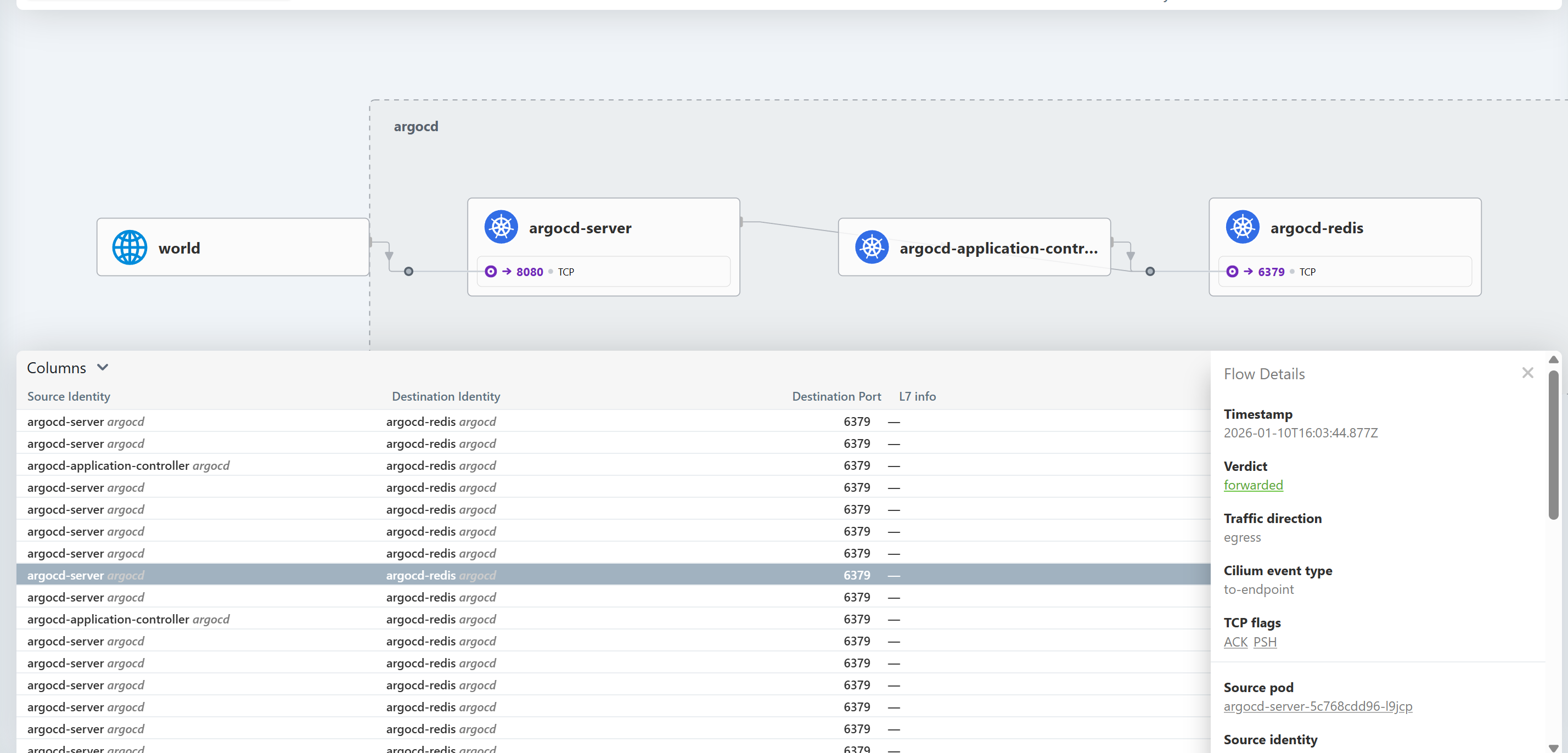Flow Logs: 네트워크 패킷의 흐름을 마치 tcpdump나 Wireshark를 사용하는 것처럼 상세하게 보여준다. 특히 Kubernetes 메타데이터(파드 이름, 네임스페이스)와 결합되어 있어 해석이 용이하다.