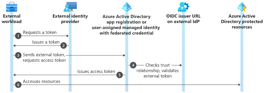 Azure AD는 외부 자격 증명 공급자(예: GitHub, Azure DevOps)가 발급한 토큰을 신뢰하도록 설정된다.