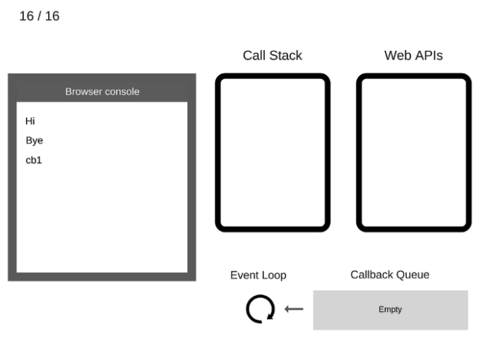 위 코드는 Call Stack에서 브라우저가 제공하는 비동기적 함수가 실행되면 Web-API를 호출하고, Callback Queued에서 대기하다가 Call Stack이 비워지면 Event-Loop에 의해 다시 Call Stack으로 이동해 함수가 실행되었다.