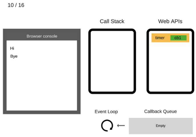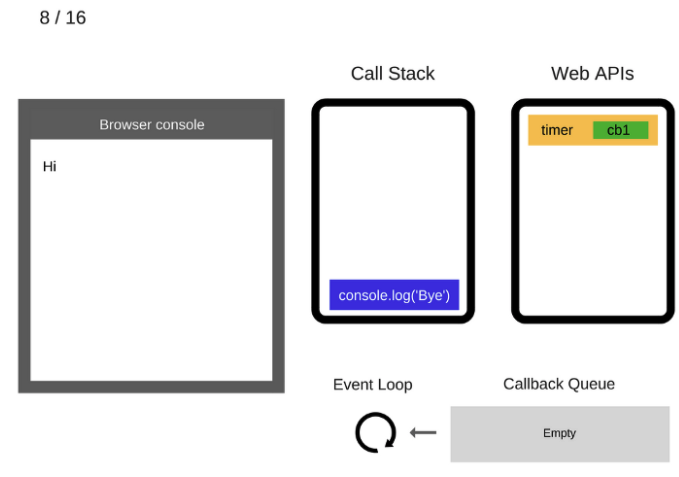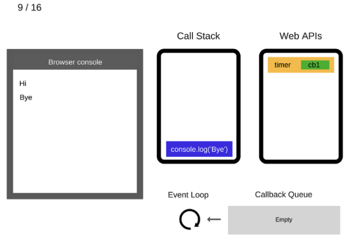 console.log('Bye')가 실행됐으므로 Call Stack에서 제거된다.