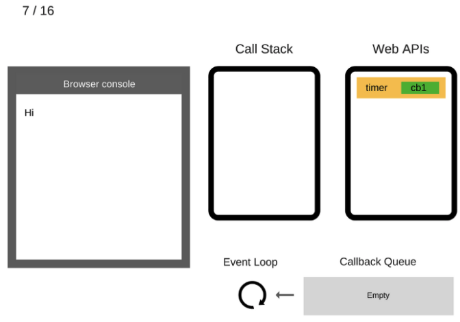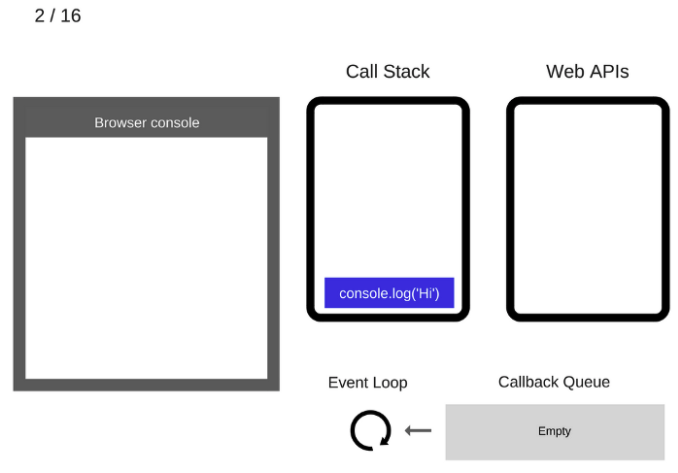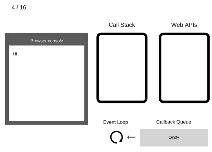 javascript가 먼저 읽는 위에서 부터 실행, 즉 console.log("hi")가 Call stack에 추가된다.