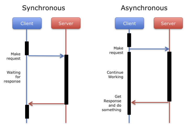 동기 (synchronous) : 동기는 말그대로 동시에 발생한다는 뜻이다. 요청을 하면 시간이 얼마 걸리던지 요청한 자리에서 결과가 주어져야한다. 다르게 말해서, 한 작업이 끝날때까진 다른 작업을 할 수 없다는 뜻이다.