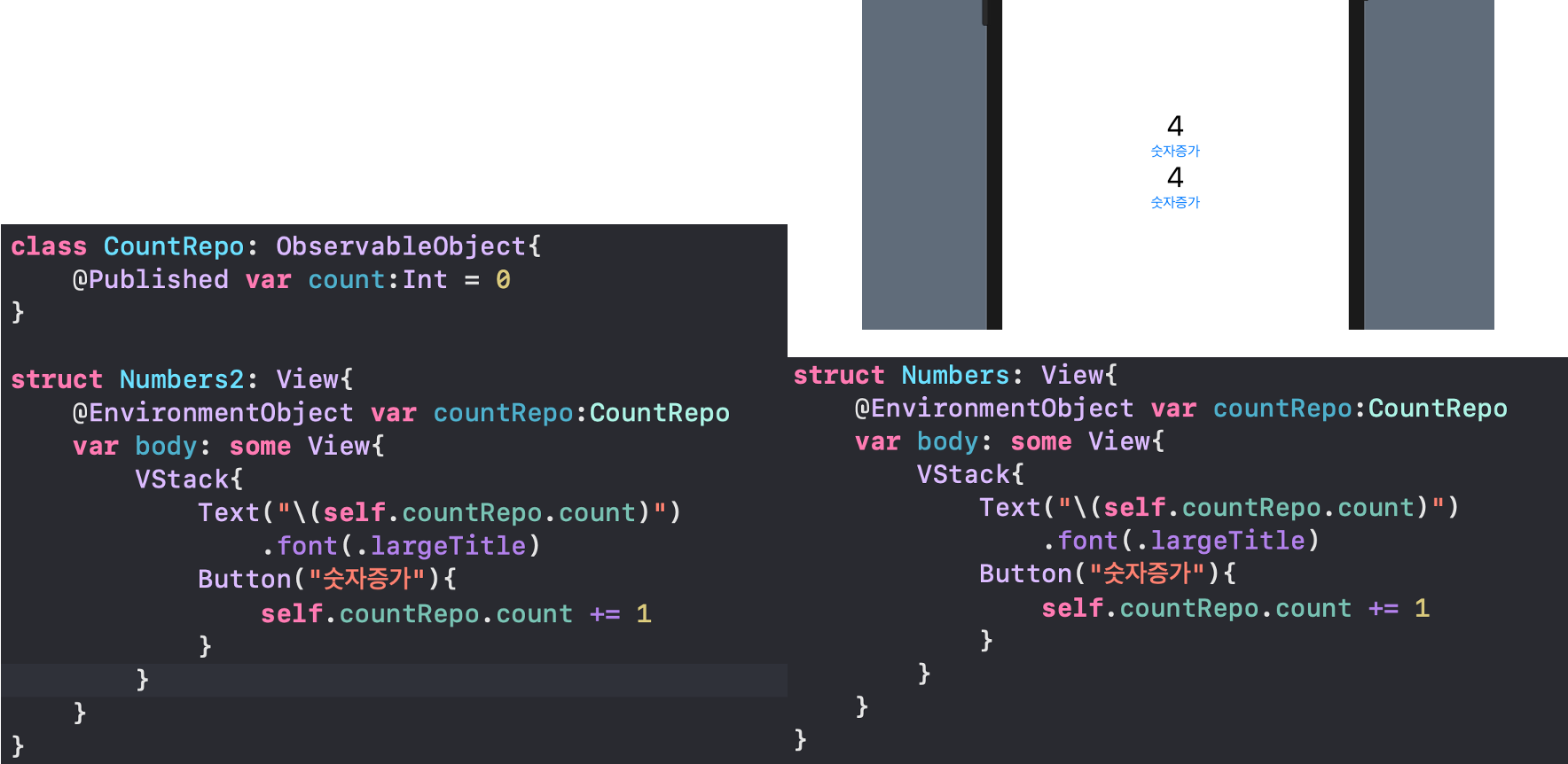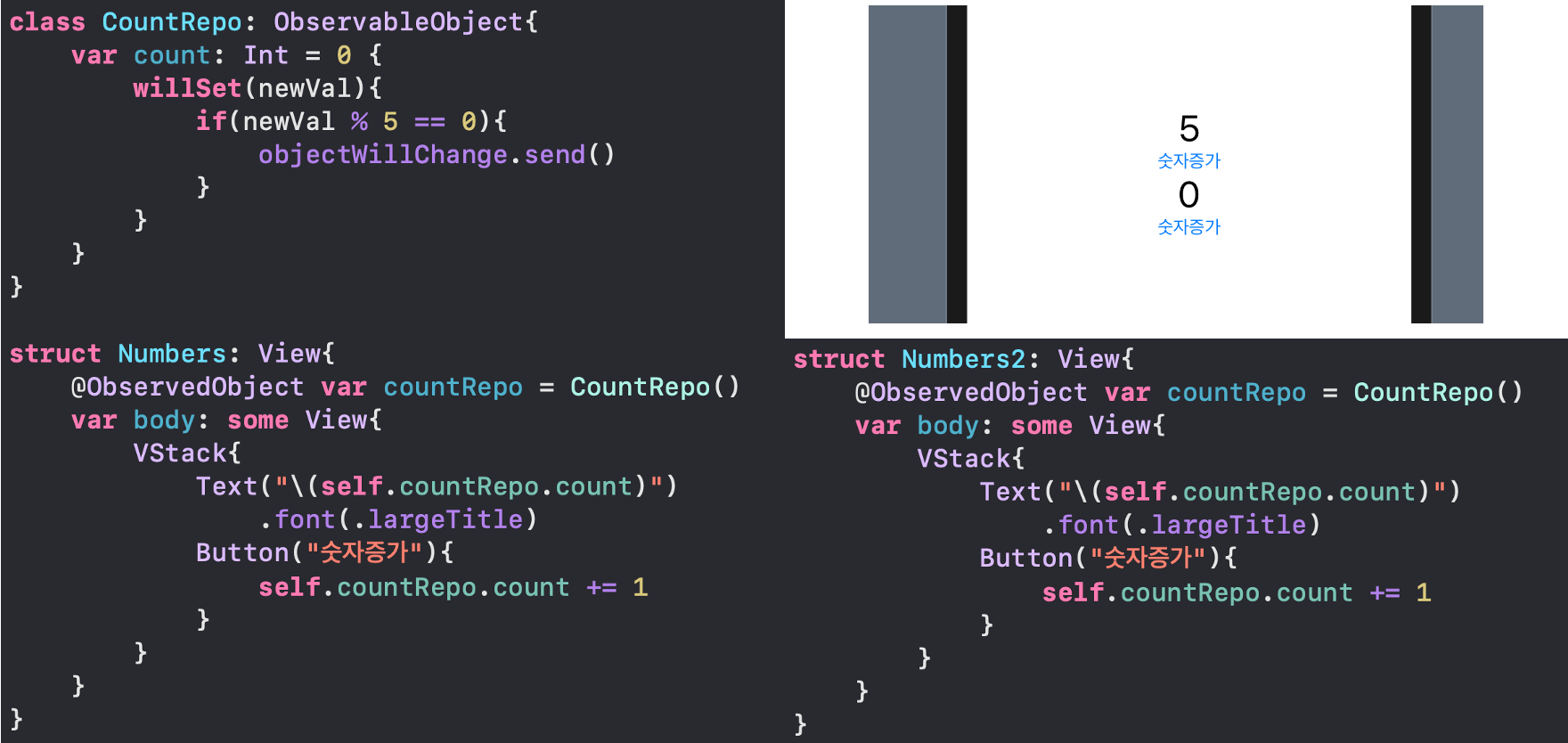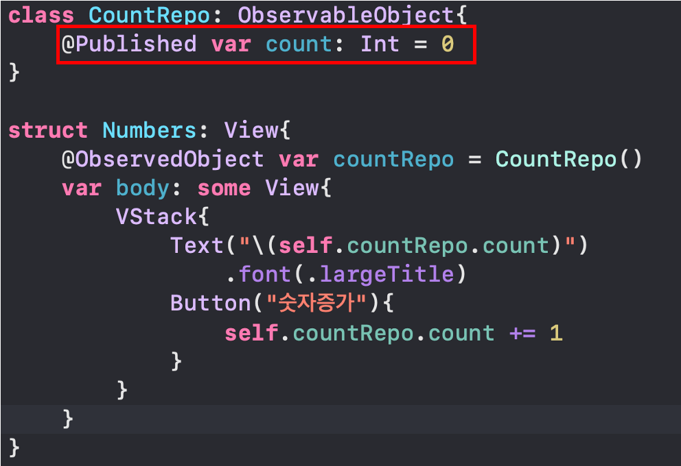 @Published로 인해 count가 변할 때 Numbers의 @ObservedObject countRepo가 즉각 반응한다.