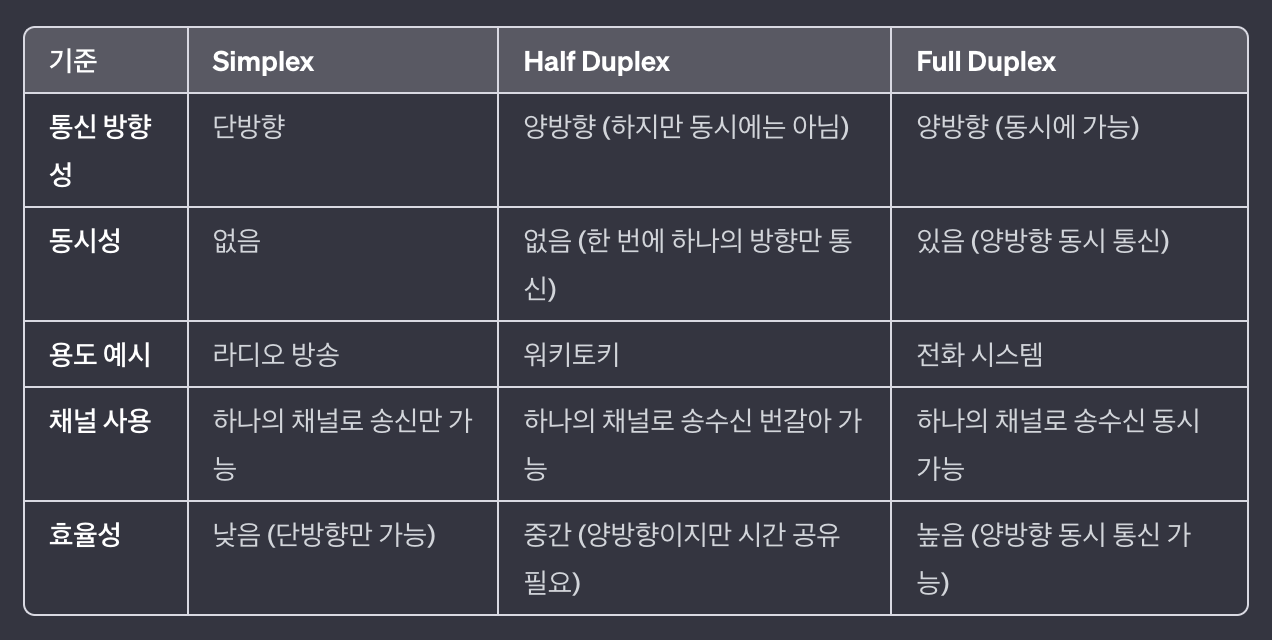 양방향 통신이 가능하지만, 한 시점에 한 방향으로만 통신할 수 있음. 예를 들어, 데이터를 보내는 동안에는 받을 수 없음