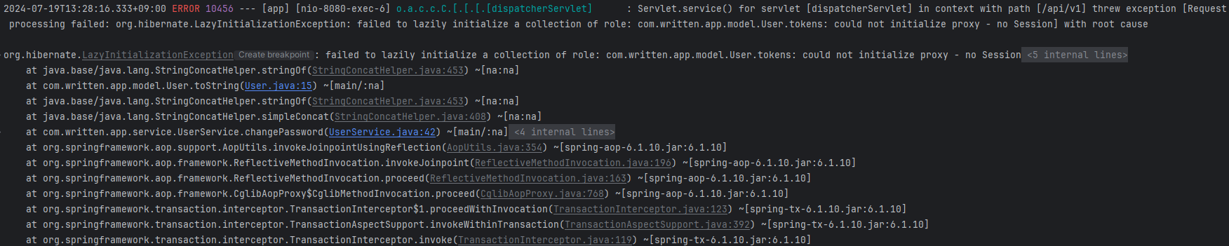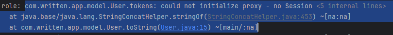 그런데 앞서 System.out.println("user = " + user); 했으니 tokens가 없는데 접근하려고하니 LazyInitializationException이 발생한 것이다.